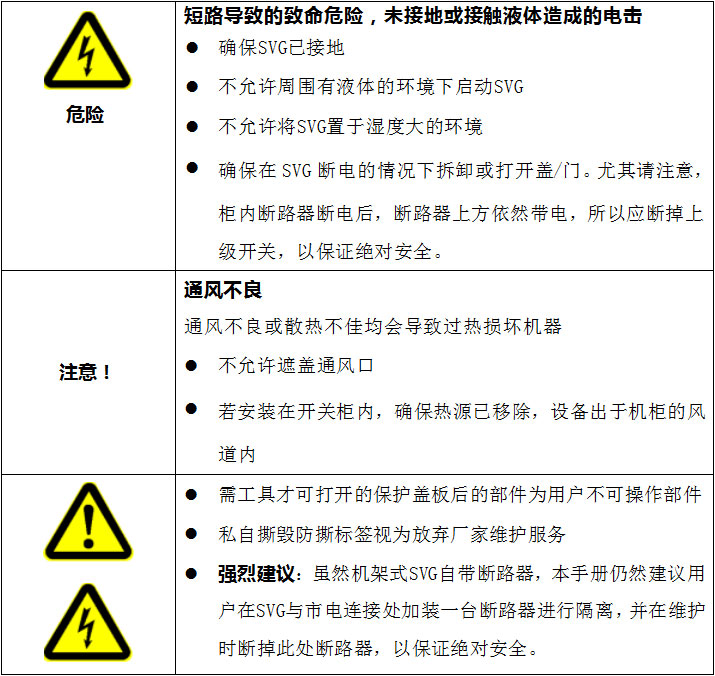 【注】:SVG装置的电气部分的安装必须由经过培训的合格工程师依据“电工法则”进行,严禁其他人员违规进行安装,本手册只介绍安装的基本内容,具体安装细节请参考电工规范。